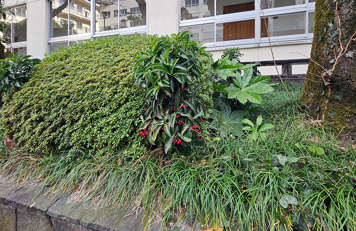 誰が植えたわけでもなく、鳥が運んだ一粒の種が、静かに根を張り、やがて赤い実を結んだのでしょう。母校で学んだ私たちもまた、この万両のようにそれぞれの地で実りを重ね、次の世代へとつないでいきたいものです。
