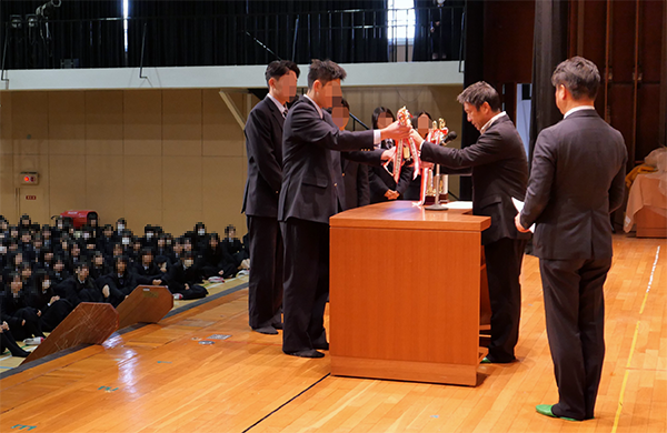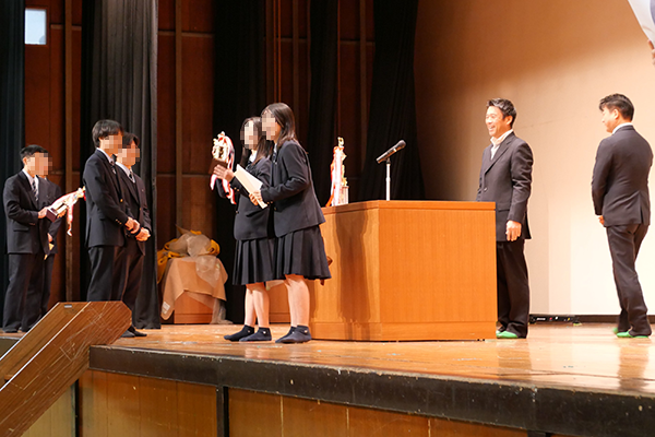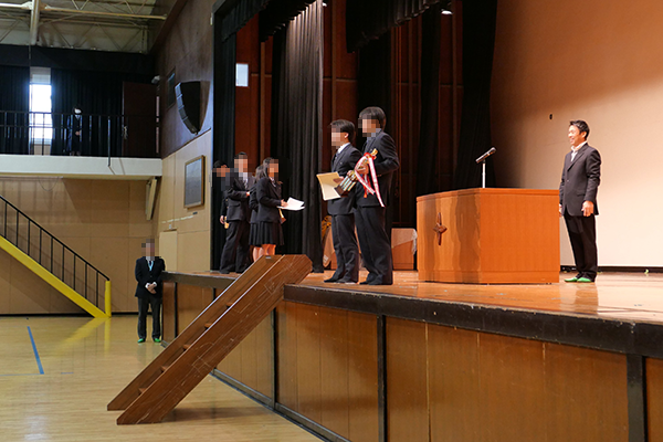 さらに、同窓会提供として恒例となった、体育祭での「部活動対抗リレー」優勝チームの表彰を行いました。今回は男子スピード部門が「野球部」、女子スピード部門が「女子バレーボール部」、そしてパフォーマンス部門が「空手道部」です。同窓会田中会長から賞状・トロフィー・目録を受け取った生徒たちは、みんな嬉しそうで、はつらつと良い表情をしていたのがとても印象的でした。