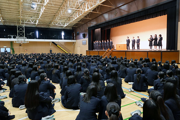 12月20日、二学期の終業式が体育館で行われました。終業式後は部活動伝達式(大会結果報告と表彰)があり、続いて全国大会に出場予定のテニス部、関東大会に出場予定のウエイトリフティング部に、同窓会から生徒奨励金の目録を贈呈いたしました。